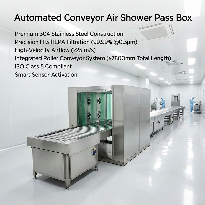통합 전동 롤러 컨베이어 + HEPA 에어 샤워 시스템.